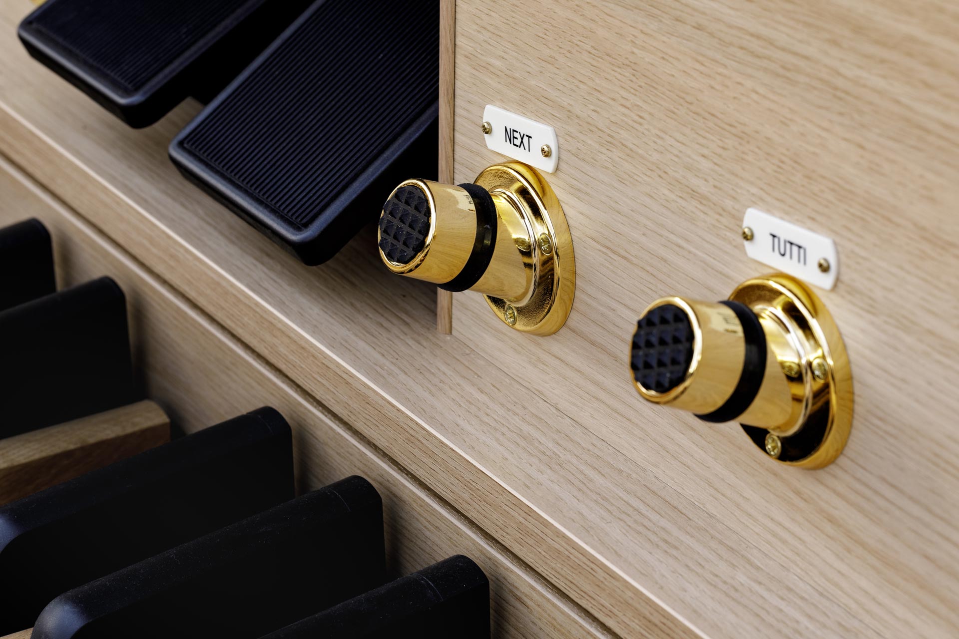 Die neuen Wippschalter zum Ein- und Ausschalten der Register, die Pistons und das Display ermöglichen eine effektive Steuerung des gesamten Instruments und wurden ergonomisch so gestaltet und angeordnet, dass sie schnell und einfach auf die Eingaben des Benutzers reagieren. Das Display befindet sich auf der rechten Seite des Instruments. Für die Speicher stehen zahlreiche Pistons zur Verfügung. Das Layout ist auf elegante Weise in das Instrument integriert, um eine breite Palette von Möglichkeiten und Anpassungen zu ermöglichen – alles ist in Reichweite.