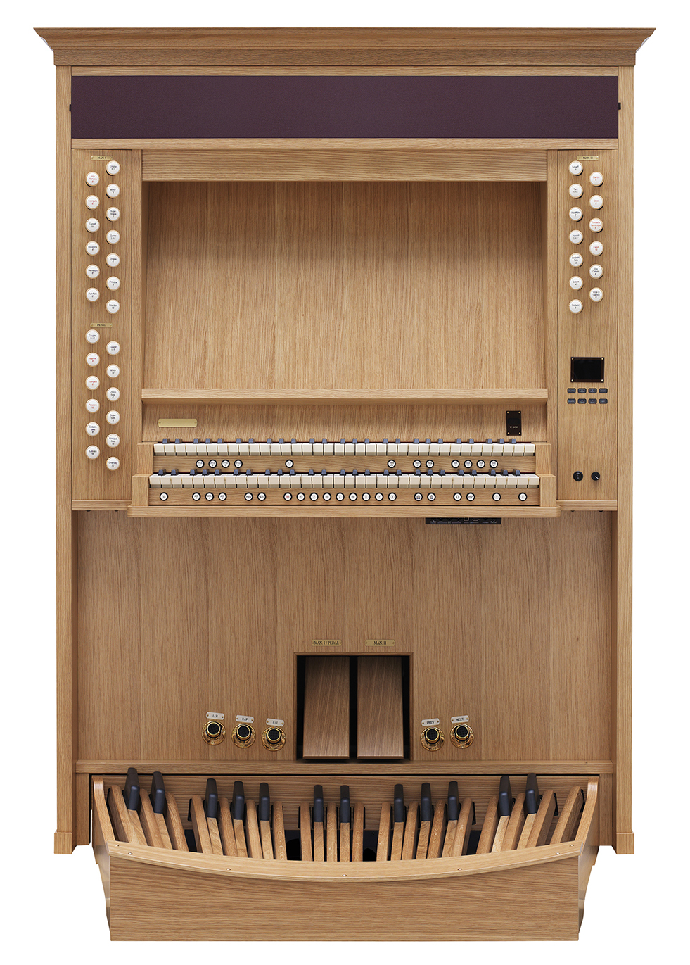 Die Registerzüge zum Ein- und Ausschalten der Register, die Pistons und alle anderen Schalter sind ergonomisch gestaltet, um schnell und einfach auf die Eingaben des Benutzers zu reagieren. Das Display befindet sich bequem auf dem Seitenpaneel mit einer eigenen Reihe von Bedienelementen. Das Layout ist intelligent in das Gerät integriert, um unbegrenzte Möglichkeiten und eine individuelle Anpassung an die Bedürfnisse des Anwenders zu ermöglichen.